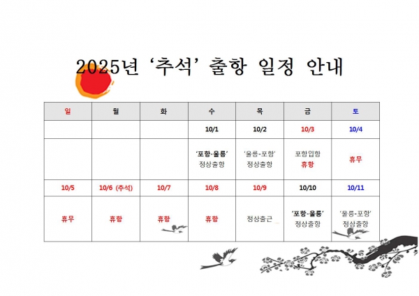 2025년 추석 운항일정 안내